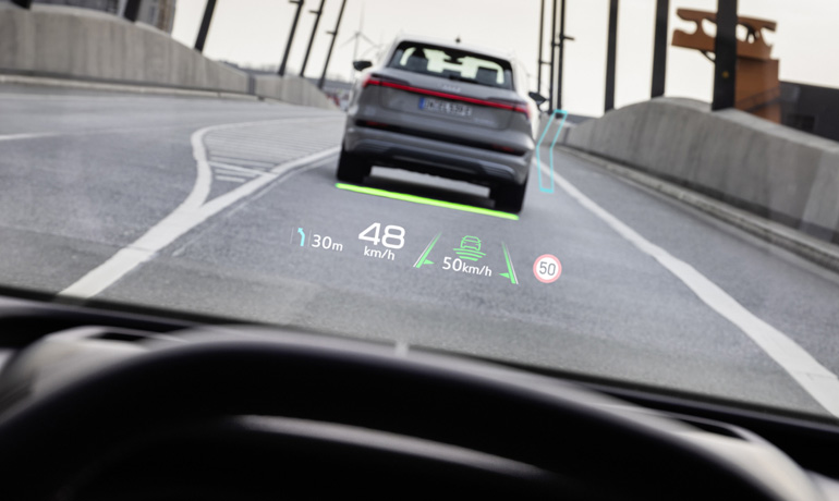 H Audi έχει εξοπλίσει το ολοκαίνουριο Q4 e-tron με ένα πρωτοποριακό σύστημα head-up display επαυξημένης πραγματικότητας. Η συγκεκριμένη τεχνολογία -προσφέρεται προαιρετικά- εξασφαλίζει στον οδηγό κορυφαία εμπειρία χειρισμού και πρωτόγνωρη λειτουργικότητα. Κάνει το παρμπρίζ μια μεγάλη οθόνη.