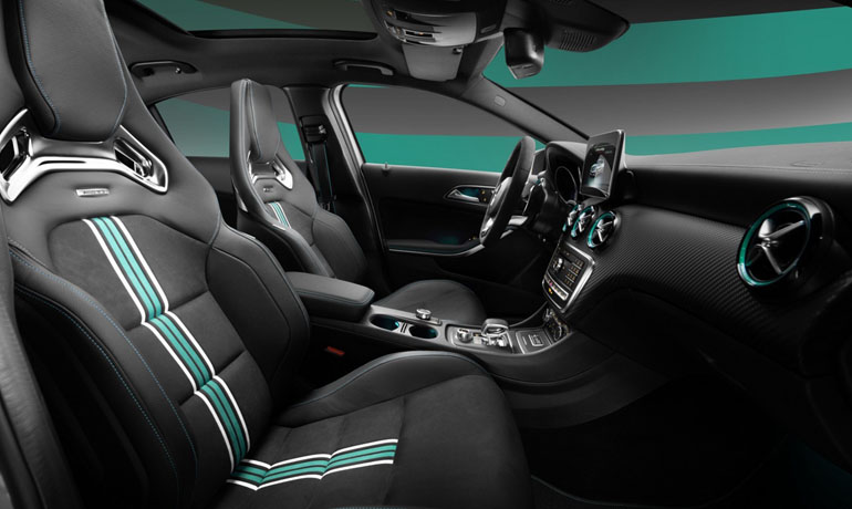Στο εσωτερικό, ξεχωρίζουν τα σπορ καθίσματα της AMG με τις πράσινες και λευκές ραφές, οι δακτύλιοι στους αεραγωγούς επίσης σε πράσινη απόχρωση, το τιμόνι Performance και το ειδικό ταμπελάκι στην κεντρική κονσόλα με το λογότυπο της αγωνιστικής ομάδας F1. Από τον εξοπλισμό, δεν λείπουν τα πακέτα AMG Exclusive Package, AMG DYNAMIC Plus Package και Night Package.