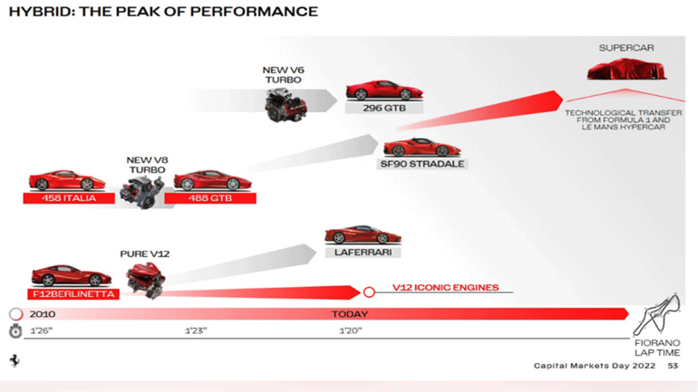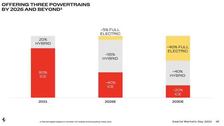 Μέχρι το 2026, μόνο το 40 τοις εκατό όλων των Ferrari θα εξακολουθούν να έχουν αποκλειστικά θερμικό μοτέρ, καθώς το 55 τοις εκατό θα είναι υβριδικά και το υπόλοιπο 5 τοις εκατό θα είναι αμιγώς ηλεκτρικά. Οι αναλογίες θα αλλάξουν ουσιαστικά έως το 2030, με τους θερμικούς κινητήρες να αντιπροσωπεύουν μόλις το 20 τοις εκατό, ενώ το 40 τοις εκατό θα είναι υβριδικά και το άλλο 40 τοις εκατό αμιγώς ηλεκτρικά.