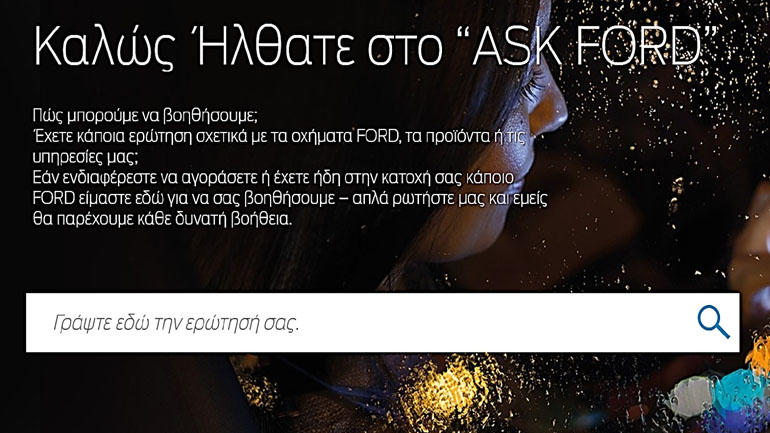 Το έξυπνο αυτό σύστημα είναι ικανό να σας καθοδηγεί σε ιστοσελίδες ή πληροφορίες εμπόρων για να βρείτε την κατάλληλη απάντηση. Στην πλατφόρμα έχουν πρόσβαση όλοι οι χρήστες μέσω της σελίδας www.ford.gr και πιο συγκεκριμένα μέσα από το εικονίδιο «Ask Ford», το οποίο εμφανίζεται στη δεξιά πλευράς της σελίδας.