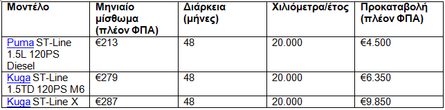 Διαθέτοντας στη φαρέτρα της τα πιο σύγχρονα και ευέλικτα προγράμματα που προσαρμόζονται στις εκάστοτε απαιτήσεις και ανάγκες των πελατών της, η υπηρεσία Ford Lease εξασφαλίζει ανταγωνιστικό μηνιαίο μίσθωμα, ελάχιστη προκαταβολή, πλήρεις καλύψεις και ένα ολοκληρωμένο πακέτο παροχών.
