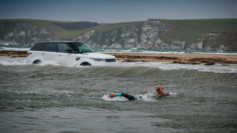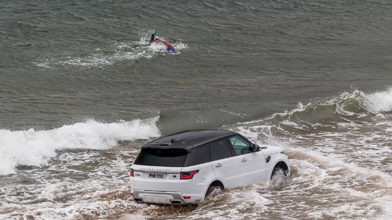 Οι δύο κολυμβητές έμειναν άφωνοι από τις δυνατότητες του υβριδικού Range Rover Sport και το γεγονός ότι δεν πήρε νερό στον χώρο του κινητήρα, παρότι η παλίρροια σκέπαζε τα πάντα στο Burgh Island.