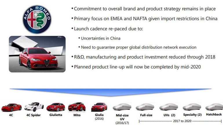 Σύμφωνα με έγγραφο που διέρρευσε από το εργοστάσιο της μάρκας, το 2017 θα δούμε ένα μεγάλο πολυτελές sedan, το οποίο θα τοποθετηθεί πάνω από την Giulia, ενώ αμέσως μετά θα παρουσιαστούν ακόμη δύο SUV. Το ένα ανήκει στην κατηγορία των compact πόλης και το άλλο στα μεγάλα premium. Το 2018-2019 αναμένονται δύο «ειδικά» αυτοκίνητα, πιθανότατα κάποιες εξελιγμένες εκδόσεις της 4C, με τον αντικαταστάτη της Giulietta να ολοκληρώνει το πλάνο.