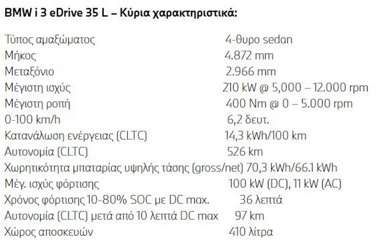 BMW i 3 eDrive 35 L – Κύρια χαρακτηριστικά: