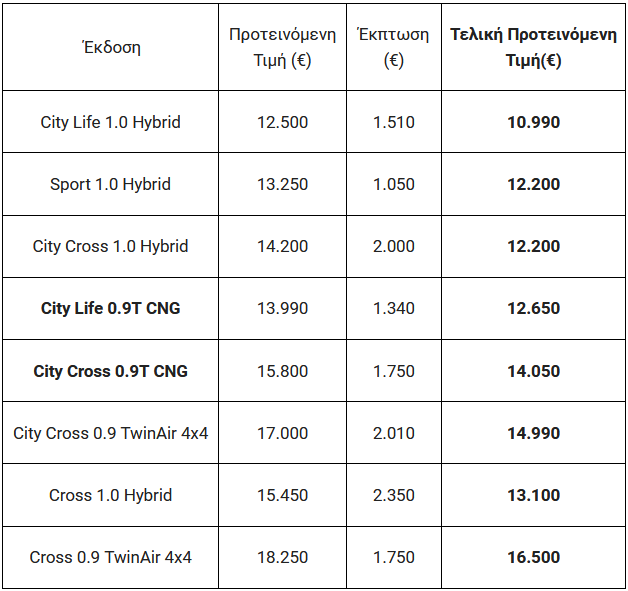 Χάρη στο προωθητικό πρόγραμμα της ελληνικής εισαγωγικής εταιρείας, το ανανεωμένο Fiat Panda CNG προσφέρεται στα 12.650 ευρώ στην έκδοση City Life. Αντίστοιχα η Cross εκδοχή κοστίζει 14.050 ευρώ.