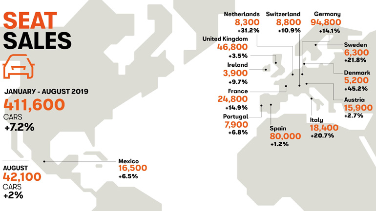 Νέο ρεκόρ πωλήσεων σημείωσε η ισπανική φίρμα τον τελευταίο μήνα του καλοκαιριού, παραδίδοντας σε πελάτες σε όλο τον κόσμο 42.100 νέα αυτοκίνητα και σημειώνοντας αύξηση 2% σε σχέση με τον Αύγουστο του 2018.