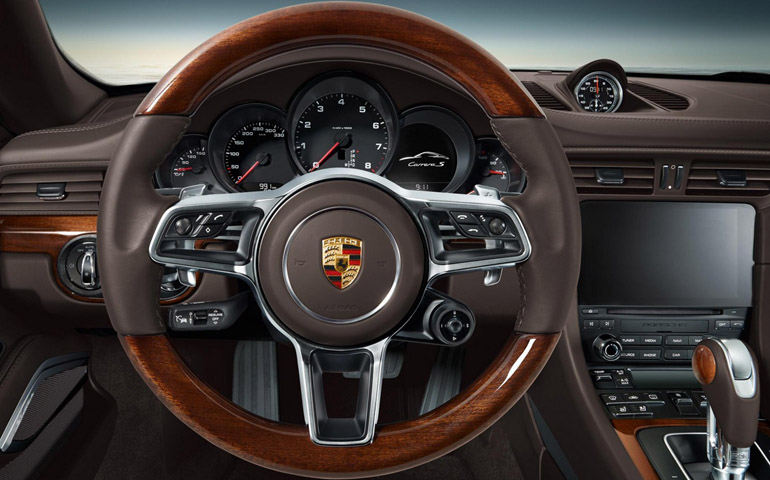 Η καινούργια 911 Carrera S Cabriolet, είναι διαθέσιμη για πρώτη φορά με επενδύσεις ξύλου στην καμπίνα και πιο συγκεκριμένα σε ταμπλό, τιμόνι, κονσόλα και πόρτες, με τις υπόλοιπες επιφάνειες να καλύπτονται από καφέ σκούρο δέρμα. Προφανώς, το τμήμα Porsche Exclusive, σκέφτηκε τους μεγαλύτερους σε ηλικία οδηγούς που επιμένουν παραδοσιακά.