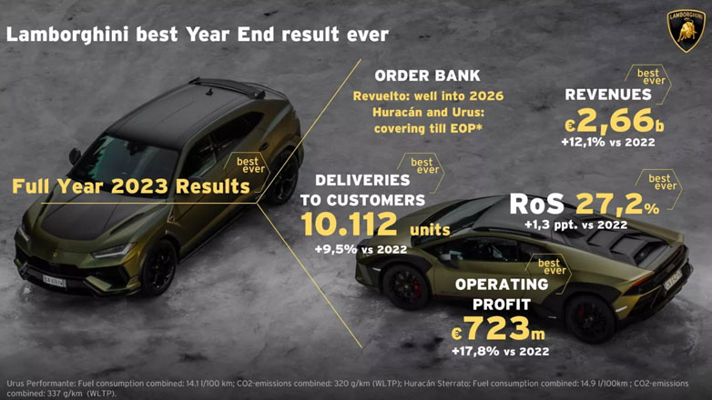 Το 2023 ήταν η καλύτερη χρονιά στην ιστορία της Lamborghini, η οποία πούλησε για πρώτη φορά περισσότερα από 10.000 οχήματα. Αυτό τη βοήθησε να αποκομίσει έσοδα ύψους 2,66 δισεκατομμυρίων ευρώ, τα περισσότερα χρήματα που έχει βγάλει ποτέ σε ένα έτος, και 12,1% περισσότερα από ό,τι έβγαλε το 2022.