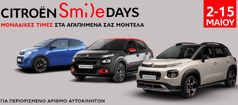 Μέσω του προγράμματος «Smile Days» που διαρκεί από τις 2 έως τις 15 Μαΐου, η Citroen προσφέρει τα μοντέλα C1, C3 και C3 Aircross σε μοναδικές τιμές και με πέντε χρόνια εγγύηση. Πιο συγκεκριμένα, μπορεί να τα αγοράσει κάποιος δίνοντας 35% προκαταβολή και από 183 ευρώ τον μήνα σε 36 άτοκες δόσεις.