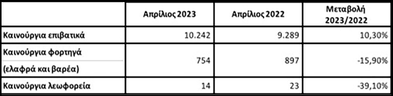 Σύμφωνα με τα πρωτογενή στοιχεία της ΕΛΣΤΑΤ και την επεξεργασία του ΣΕΑΑ οι ταξινομήσεις καινούργιων οχημάτων τον Απρίλιο 2023 έχουν ως εξής: