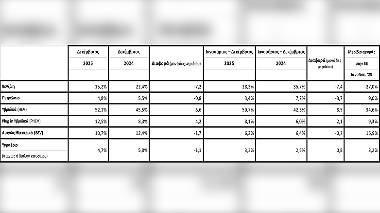 Να δούμε τώρα τι κινητήρες επέλεξαν οι 144.200 αγοραστές. Τα υβριδικά αυτοκίνητα το 2024 το μήνα Δεκέμβριο 25 είχαν 52.1 τον αντίστοιχο μήνα του 2024 ήταν 45.5% (αύξηση 6.6%.
