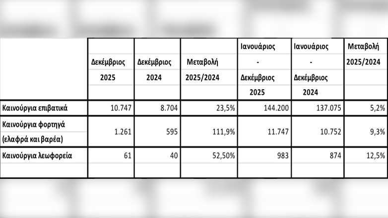 Από την 1 Ιανουαρίου 2025 έως και τις 31 Δεκεμβρίου 2025 ταξινομήθηκαν 144.200 νέα Ι.Χ ενώ το αντίστοιχο διάστημα του 2024 είχαν ταξινομηθεί 137.075 αυτοκίνητα. Φέτος η αύξηση ήταν +5.2%