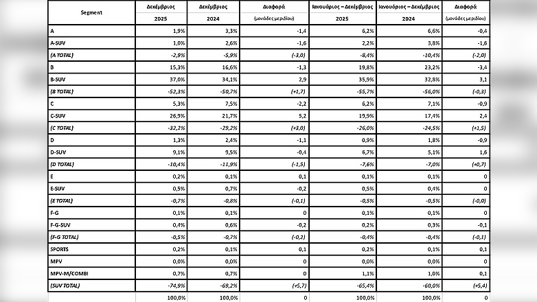 Tο Β segment βρέθηκε και πάλι στην κορυφή των προτιμήσεων του αγοραστικού κοινού. Οι αγοραστές στην Ελλάδα επέλεξαν με διαφορά τη B- TOTAL κατηγορία. Τον Δεκέμβριο η B- TOTAL είχε το 50.7% και το 2025 το 52.3% . Τους 12 μήνες του 2024 είχε 56% και το αντίστοιχο διάστημα του 2025 είχε 55.7%. Το 2025 η κατηγορία αυτή έχασε -0.3%.
