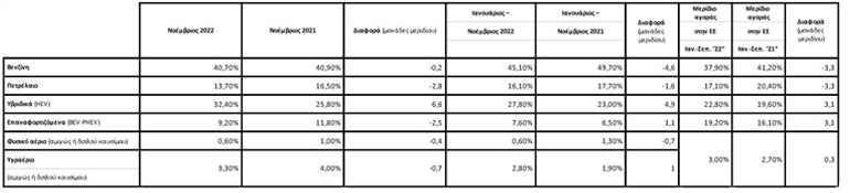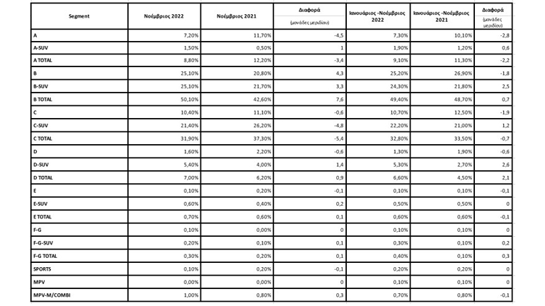 Σύμφωνα με πρώτους υπολογισμούς, η πρόοδος στα segments επιβατικών και στην κατανομή ανά καύσιμο, ως και τον Νοέμβριο, έχει ως εξής: