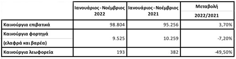 Σύμφωνα με τα στοιχεία από τον Ιανουάριο μέχρι το Νοέμβριο φέτος ταξινομήθηκαν 98.804 Ι.Χ ενώ το αντίστοιχο διάστημα το 2021 οι ταξινομήσεις ήταν 95.256 Ι.Χ. Η αύξηση αγγίζει το +3.7%.