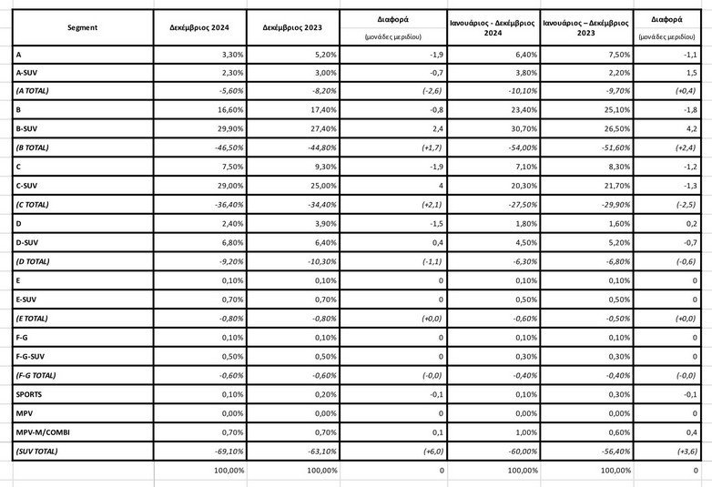 Τις προτιμήσεις των αγοραστών κέρδισε με διαφορά η B Total κατηγορία με ποσοστά 46.5% έναντι 44.8% που σημειώθηκε το 2023. Αν δούμε την περίοδο Ιανουάριος-Δεκέμβριος φέτος το ποσοστό στην B Total κατηγορία ήταν 54% έναντι 51.6% (2023). Η διαφορά ήταν +2.4%