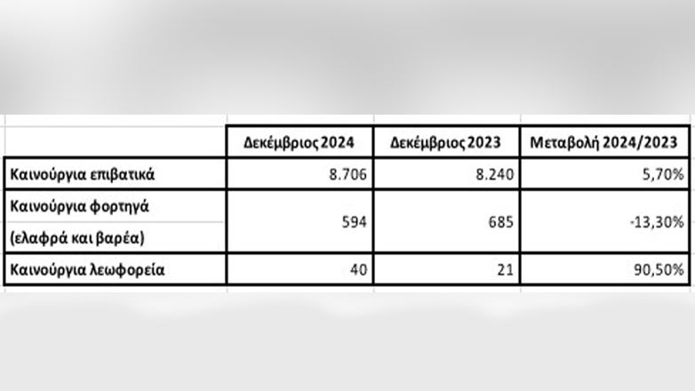 Αν και ο Δεκέμβριος του 2024 έκλεισε με άνοδο +5,7% σε σχέση με τον Δεκέμβριο του 2023 ωστόσο η συνολική άνοδος της χρονιάς που πέρασε ήταν οριακή. Σύμφωνα με τα πρωτογενή στοιχεία της ΕΛΣΤΑΤ και την επεξεργασία του ΣΕΑΑ οι ταξινομήσεις καινούργιων οχημάτων τον περασμένο μήνα (Δεκέμβριο) έφθασαν τις 8.706 αυτοκίνητα (το Δεκέμβριο του 2023 είχαμε 8.240) και η άνοδος σε ποσοστά ήταν +5.7%. Σ αυτή την άνοδο του Δεκεμβρίου βοήθησαν κάπως οι προσφορές που έκαναν οι εταιρίες λόγω εορτών.
