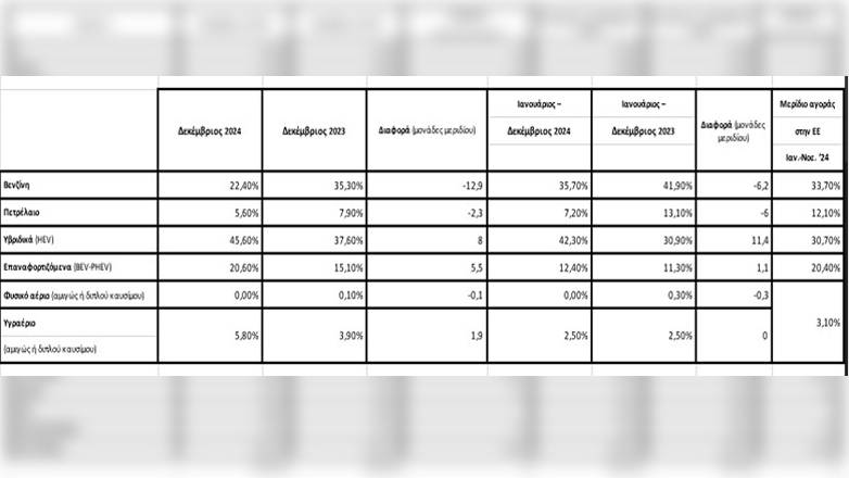 Τα αυτοκίνητα με υβριδικούς κινητήρες κέρδισαν με μεγάλη διάφορα τις προτιμήσεις των αγοραστών. Φέτος τα υβριδικά (HEV) έφθασαν το 45.6% ( 37.6% ήταν το 2023 ενώ στο σύνολο της χρονιάς είχαμε 12.4% (11.3% το 2023). Το σύνολο της χρονιάς ήταν +1.1% και το μερίδιο αγοράς ήταν 20.4 στην Ε.Ε