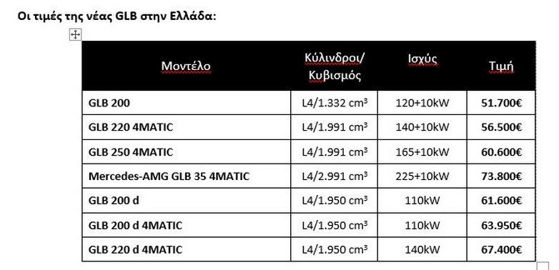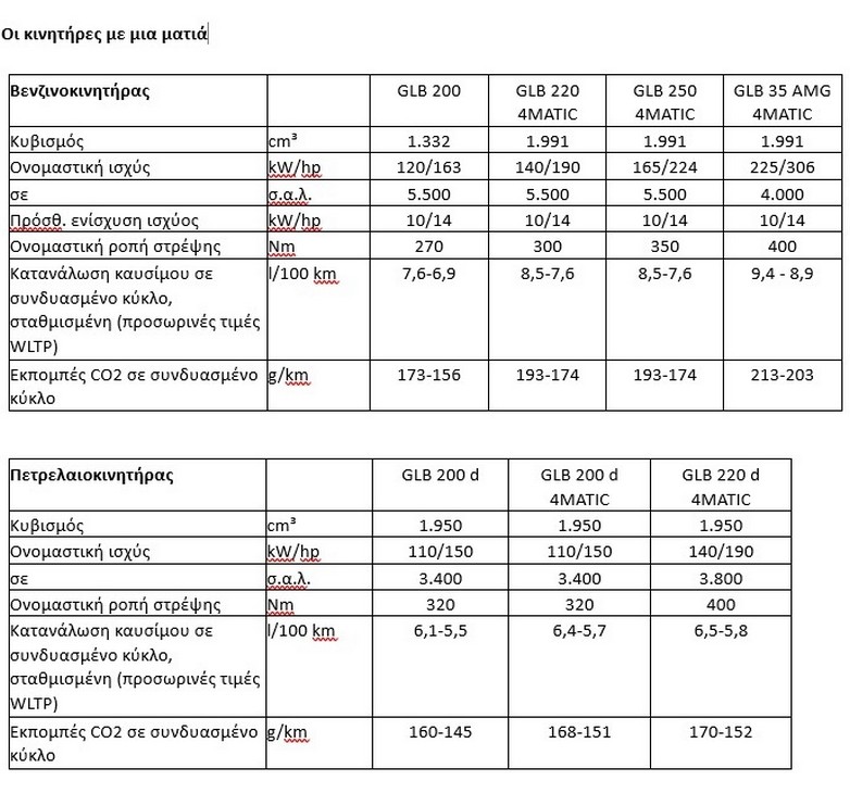 Η νέα GLB διατίθεται στην Ελλάδα με τέσσερις επιλογές βενζινοκινητήρων και τρεις επιλογές πετρελαιοκινητήρων. Η γκάμα περιλαμβάνει τετρακύλινδρα σύνολα με κιβώτιο διπλού συμπλέκτη DCT επτά ή οκτώ ταχυτήτων. Οι δύο βενζινοκινητήρες υψηλότερης απόδοσης διατίθενται με το μεταβλητό σύστημα τετρακίνησης 4MATIC.