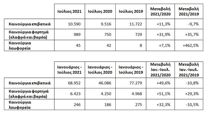 Με βάση τα πρωτογενή στοιχεία της και την επεξεργασία του ΣΕΑΑ οι ταξινομήσεις καινούργιων οχημάτων τον περασμένο μήνα ήταν κατά 1074 περισσότερα από αυτά που ταξινομήθηκαν τον Ιούλιου του 2020.