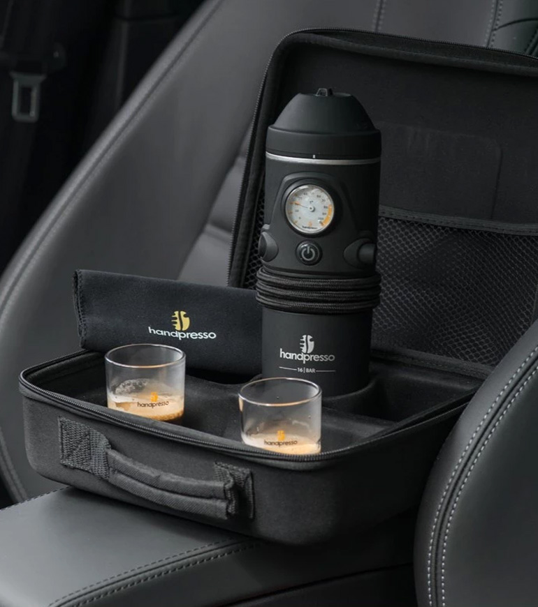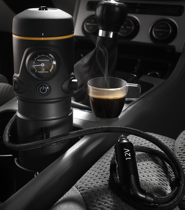 Η Handpresso έχει σχεδιαστεί ώστε να χωράει στις ποτηροθήκες ανάμεσα στα καθίσματα οδηγού και συνοδηγού. Τροφοδοτείται με ενέργεια από την πρίζα 12V και βγάζει μία δόση καφέ 50 ml σε περίπου 3 λεπτά. Είναι πολύ απλή στη χρήση της και λειτουργεί με κάψουλες.