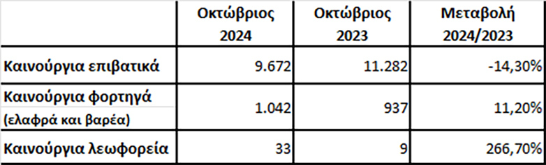 Με βάση τα πρωτογενή στοιχεία της ΕΛΣΤΑΤ και την επεξεργασία του ΣΕΑΑ οι ταξινομήσεις των καινούργιων οχημάτων τον μήνα Οκτώβριο παρουσίασαν πτώση της τάξης του -14.3%.