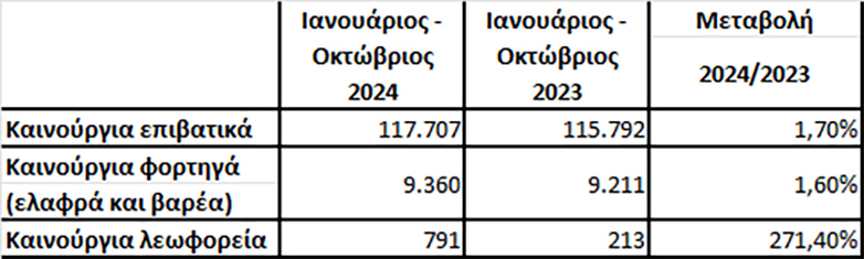 Ωστόσο αν πάρουμε τις ταξινομήσεις από τον Ιανουάριο έως τον Οκτώβριο του 2024 υπάρχει μια μικρή άνοδος της τάξης του +1.7% σε σχέση με το αντίστοιχο διάστημα του 2023. Φέτος στους δέκα πρώτους μήνες ταξινομήθηκαν 117.707 Ι.Χ ενώ το αντίστοιχο διάστημα πέρυσι ταξινομήθηκαν 115.792 ΙΧ