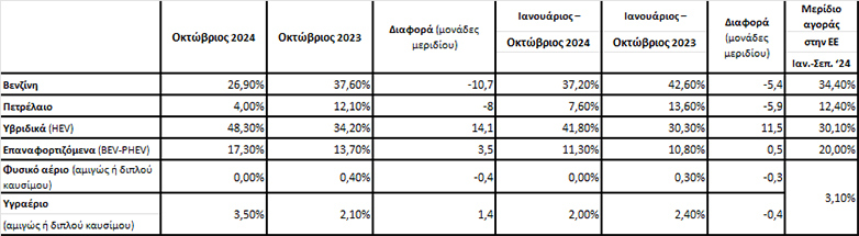 Τα αυτοκίνητα με υβριδικούς κινητήρες (HEV) είχαν και πάλι τις περισσότερες ταξινομήσεις. Το 2024 είχαν 48.3% ενώ το 2023 41.8%. Στη 2η θέση παραμένουν τα αυτοκίνητα με κινητήρες βενζίνης. Το 2024 σημείωσαν ποσοστά 26.9% ενώ το 2023 ο αριθμός ήταν σαφώς υψηλότερος (37.6%).