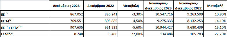 Σε επίπεδο ΕΕ, με βάση τα στοιχεία του Ευρωπαϊκού Συνδέσμου Κατασκευαστών Αυτοκινήτων (www.acea.be), η αγορά των επιβατικών το 2023 κινήθηκε ως εξής: