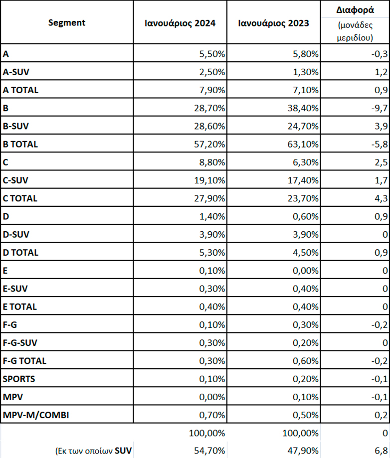 Σύμφωνα με πρώτους υπολογισμούς, η πρόοδος στα segments επιβατικών και στην κατανομή ανά καύσιμο, για τον Ιανουάριο, έχει ως εξής: