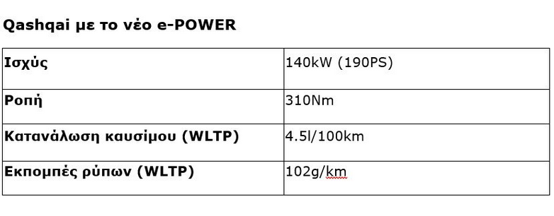 Σε αντίθεση με τα παραδοσιακά υβριδικά, το σύστημα Qashqai e-POWER χρησιμοποιεί έναν βενζινοκινητήρα αποκλειστικά για την παραγωγή ηλεκτρικής ενέργειας, η οποία με τη σειρά της τροφοδοτεί έναν ηλεκτροκινητήρα που κινεί τους τροχούς. Αυτό σημαίνει ότι οι τροχοί κινούνται μόνο με ηλεκτρική ενέργεια, παρέχοντας άμεση ροπή, ομαλή επιτάχυνση και πιο αθόρυβη οδήγηση – όλα αυτά χωρίς να χρειάζεται να συνδέσετε το αυτοκίνητο στην πρίζα.