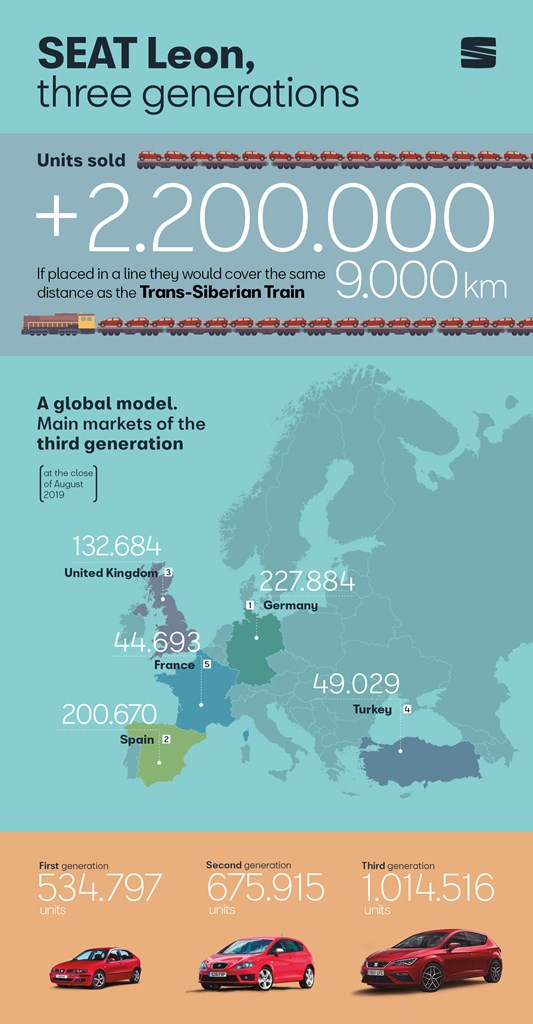 Στα 20 χρόνια κυκλοφορίας του Leon έχουν λανσαριστεί τρεις γενιές, με την τελευταία να είναι η πιο επιτυχημένη εμπορικά, ξεπερνώντας το 1 εκατομμύριο αντίτυπα. Όλα τα μοντέλα, από το πρώτο έως το τελευταίο, σχεδιάστηκαν, εξελίχθηκαν και κατασκευάστηκαν στις εγκαταστάσεις της Seat στο Martorell της Βαρκελώνης.