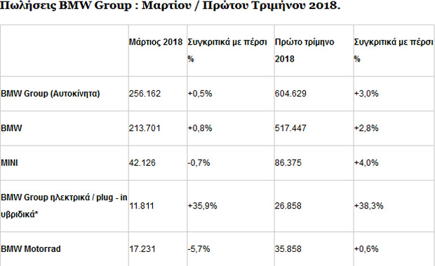 Επιτυχημένο ήταν το πρώτο τρίμηνο και για τη MINI, με τη μάρκα να κάνει ρεκόρ με 86.375 πωλήσεις, ενώ σημαντική αύξηση εμφάνισε και η premium φίρμα Rolls – Royce. Τέλος, εντυπωσιακά ήταν τα νούμερα στην κατηγορία των ηλεκτρικών και plug-in υβριδικών μοντέλων με το Group να πουλάει 26.858 αυτοκίνητα (+38,3%).