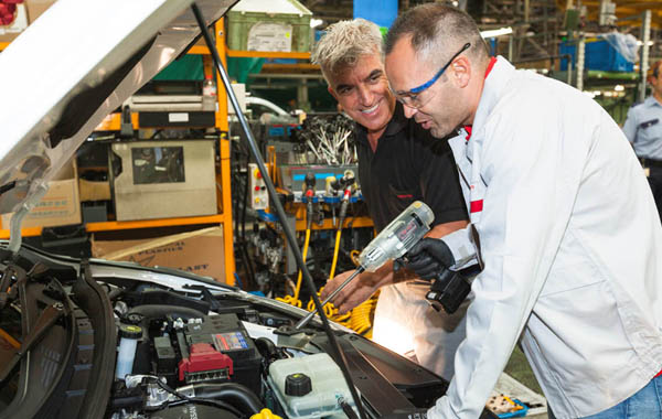Ο Iniesta πριν παραλάβει τα κλειδιά του πρώτου Pulsar που βγήκε από τη γραμμή παραγωγής, φόρεσε τη φόρμα, τα γάντια και τα γυαλιά, υποδυόμενος για λίγο τον εργαζόμενο του εργοστασίου.
