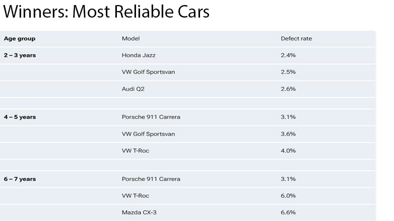 Στο άλλο άκρο της κλίμακας, υπήρχαν καλά νέα για όσους θέλουν να αγοράσουν μια μεταχειρισμένη Porsche ή μια καινούργια που σκοπεύουν να κρατήσουν για μεγάλο χρονικό διάστημα. Η 911 Carrera αξιολογήθηκε ως η κορυφαία και στις πέντε ηλικιακές κατηγορίες μεταξύ 4-13 ετών. Αλλά αποδεικνύοντας ότι δεν χρειάζεται να ξοδέψετε μια περιουσία για να αγοράσετε ένα ποιοτικό και αξιόπιστο αυτοκίνητο, το Honda Jazz πήρε το χρυσό στην κατηγορία 2-3 ετών. Στα ηλεκτρικά, το VW e-Golf βγήκε το πιο αξιόπιστο.
