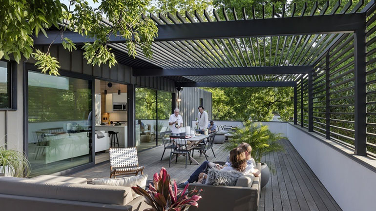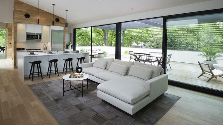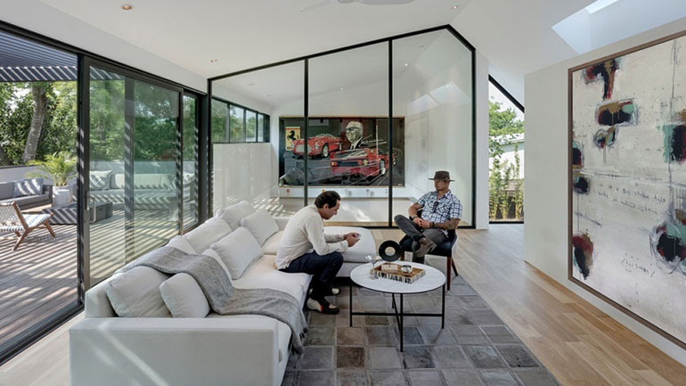 Διαθέτει δύο γκαραζόπορτες, μία από κάθε πλευρά και ειδικά διαμορφωμένο δάπεδο ώστε να πατούν τα οχήματα. Η κατοικία είναι έξυπνα διαρρυθμισμένη, καλαίσθητη και με μοντέρνα σχέδια.