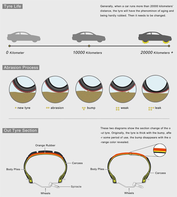 Η ιδέα είναι πολύ απλή. Τα συγκεκριμένα ελαστικά έχουν στο εσωτερικό τους χρώμα το οποίο αλλάζει ανάλογα με τα χιλιόμετρα. Με αυτόν τον τρόπο «ενημερώνεται» ο οδηγός για την κατάσταση του ελαστικού και το αν χρειάζεται αντικατάσταση ή όχι.