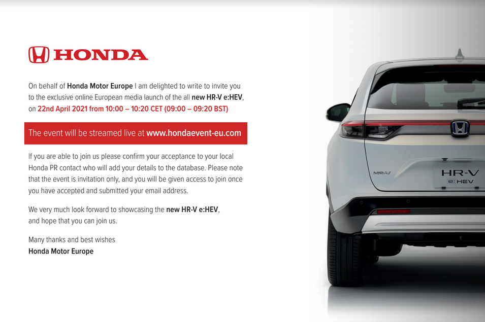 Στις 22 Απριλίου η Honda ανακοίνωσε τη διαδικτυακή δημοσιογραφική παρουσίαση του νέου HR-V e:HEV.
