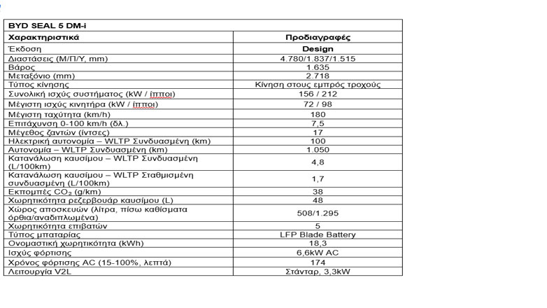 Το SEAL 5 DM-i διαθέτει περισσότερη από αρκετή ισχύ για την καθημερινή οδήγηση, επιταχύνοντας από 0-100χλμ./ώρα σε μόλις 7,5 δευτερόλεπτα. Ωστόσο, η εξελιγμένη τεχνολογία Super DM συνδυάζει αυτήν την απόδοση με εξαιρετικά χαμηλή μεικτή κατανάλωση καυσίμου (WLTP σταθμισμένη συνδυασμένη) μόλις 1,7λτ.100χλμ. μειώνοντας σημαντικά το καθημερινό κόστος χρήσης. Αν η μπαταρία είναι πλήρως φορτισμένη και το ρεζερβουάρ γεμάτο, αυτό το υπερσύγχρονο sedan προσφέρει συνδυασμένη αυτονομία άνω των 1.000χλμ. ιδανική για ταξίδια μεγάλων αποστάσεων.