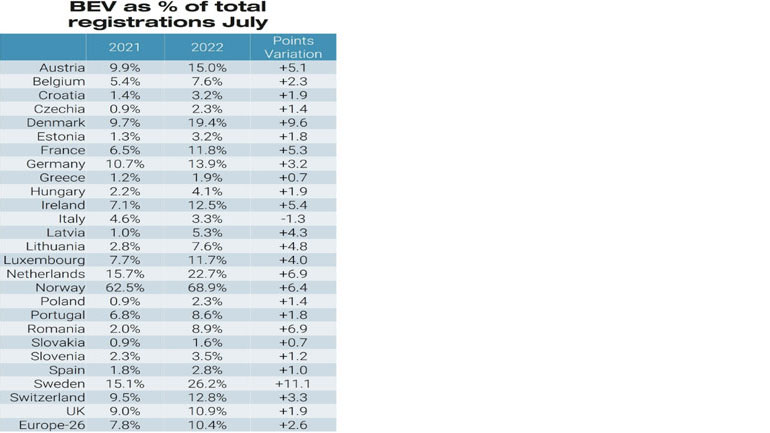 Η Νορβηγία συνεχίζει να ηγείται της μετάβασης στα ηλεκτρικά οχήματα με το 68,9% των νέων οχημάτων που ταξινομήθηκαν τον Ιούλιο να είναι EV. Το μερίδιο των ηλεκτρικών οχημάτων που πωλήθηκαν στη Σουηδία επίσης εκτινάχθηκε σημαντικά κατά 11,1 τοις εκατό στο 26,2 τοις εκατό τον Ιούλιο του 2022. Άλλες αγορές που ανέφεραν σημαντικά άλματα στον αριθμό των ταξινομημένων ηλεκτρικών οχημάτων ήταν η Δανία (αύξηση 9,6 τοις εκατό από τον Ιούλιο του 2021), η Ολλανδία ( αύξηση 6,9 τοις εκατό), Ρουμανία (αύξηση 6,9 τοις εκατό) και Νορβηγία (αύξηση 6,4 τοις εκατό).