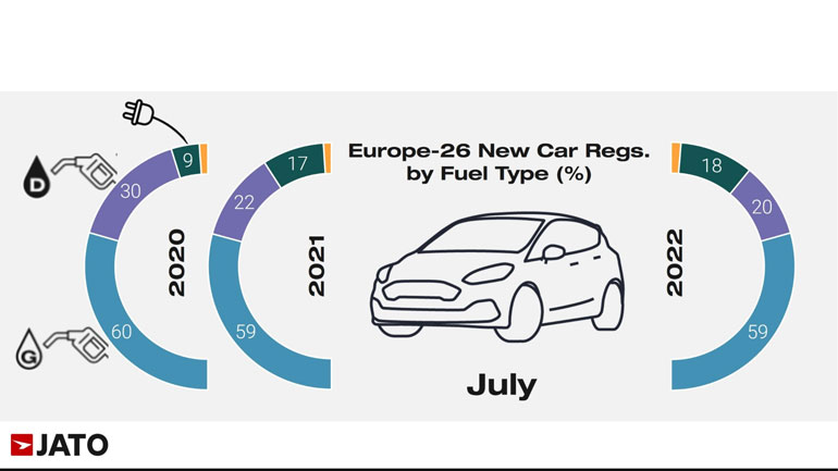 Το EV με τις μεγαλύτερες πωλήσεις στην Ευρώπη τον Ιούλιο ήταν το Fiat 500e με 4.999 συνολικές ταξινομήσεις, τοποθετώντας το πάνω από το VW ID.4 με 4.551, το Skoda Enyaq iV με 4.530 και το VW ID.3 με 3.664 ταξινομήσεις. Άλλα ηλεκτρικά οχήματα με καλές πωλήσεις περιλαμβάνουν το Renault Megane E-Tech (3.520 μονάδες), το Peugeot e-208 (3.412 μονάδες), το Hyundai Kona Electric (3.383 μονάδες), το Dacia Spring (3.004 μονάδες), το Cupra Born (2.986 μονάδες) και το Hyundai Ioniq 5 με 2.854 εγγραφές.