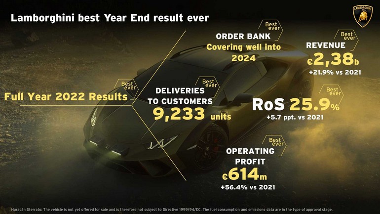 Τα πρόσφατα ανακοινωθέντα οικονομικά αποτελέσματα της Lamborghini, δείχνουν έσοδα 2,38 δισεκατομμυρίων ευρώ για το 2022, τα οποία ήταν 22 τοις εκατό υψηλότερα από το 2021. Η εταιρεία σημειώνει λειτουργικά κέρδη 614 εκατομμύρια ευρώ, νούμερο που μεταφράζεται σε αύξηση 56% σε σχέση με το 2021.