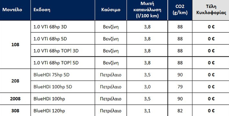 Το όριο έπεσε αρκετά χαμηλά, ωστόσο, υπάρχουν κάποιες εταιρείες που έχουν στη γκάμα τους αρκετά μοντέλα που απαλλάσσονται. Μια από αυτές είναι η Peugeot. Η γαλλική φίρμα διαθέτει αρκετά αυτοκίνητα που εκπέμπουν κάτω από 90 γρ/χλμ., καταναλώνοντας παράλληλα μικρή ποσότητα καυσίμου. Πρόκειται για τη βενζινοκίνητη έκδοση του νέου 108 και τις πετρελαιοκίνητες εκδόσεις BlueHDi των 208, 2008 και 308.