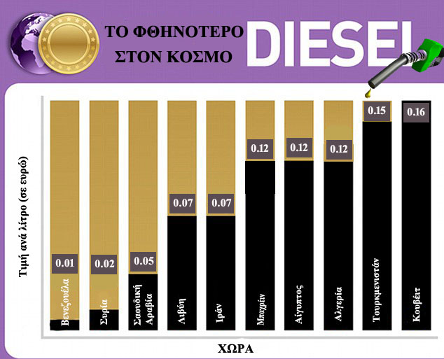 Σχεδόν… δωρεάν διατίθεται το πετρέλαιο κίνησης στην Βενεζουέλα ενώ το πιο ακριβό diesel κίνησης πωλείται στην Νορβηγία με 1.71 ευρώ ανά λίτρο. Στον παρακάτω πίνακα μπορείτε να δείτε και συγκρίνεται στοιχεία που δημοσιεύτηκαν την Δευτέρα 9 Ιουνίου 2014.