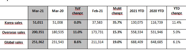 Αύξηση στις παγκόσμιες πωλήσεις του Μαρτίου 2021 σε σχέση με τον αντίστοιχο μήνα πέρυσι ανακοίνωσε η KIA Corporation.