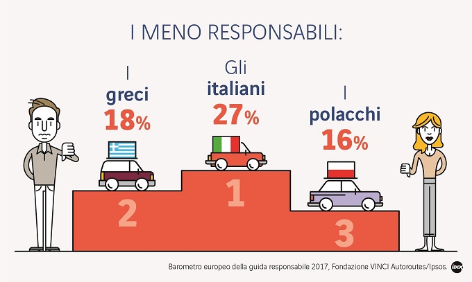 Αντιθέτως, οι Ιταλοί θεωρούνται οι λιγότερο υπεύθυνοι σε ποσοστό 27%, με τους Έλληνες να είναι δεύτεροι με (18%) και οι Πολωνοί τρίτοι με (16%). Οι Γάλλοι κατέχουν την τέταρτη θέση από κοινού με τους Ισπανούς (8%). Οι πέντε τελευταίοι τοποθετούν επίσης τη χώρα τους στην κορυφή της κατάταξης με τους λιγότερο υπεύθυνους οδηγούς.