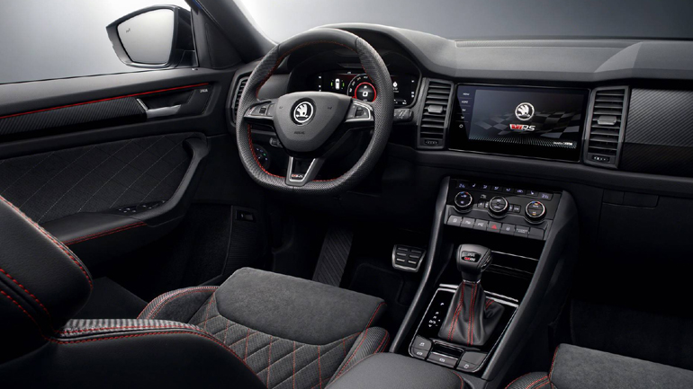 Η Skoda έδωσε στη δημοσιότητα ορισμένες φωτογραφίες από το εσωτερικό του Kodiaq RS, εντυπωσιάζοντας με την αισθητική και την ποιότητα. Το αυτοκίνητο διαθέτει στάνταρ σπορ καθίσματα με ενσωματωμένα προσκέφαλα, επενδύσεις alcantara και κόκκινες ραφές. Τα πλαϊνά των εμπρός καθισμάτων καλύπτονται από «carbon δέρμα», όπως αναφέρει χαρακτηριστικά η εταιρεία, προσφέροντας άριστη στήριξη στο σώμα του οδηγού και του συνοδηγού.