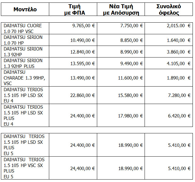 Η προσφορά της εταιρείας αφορά τα μοντέλα Terios, Cuore, Sirion και Charade, ενώ για συγκεκριμένες μονάδες Terios προσφέρονται ως δώρο τα τέλη κυκλοφορίας. Η αγορά συνοδεύεται και με χρηματοδοτικά προγράμματα που ξεκινούν από 0% προκαταβολή και έως 84 μηνιαίες δόσεις.