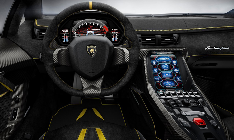 Χάρμα ιδέσθαι είναι το εσωτερικό, θυμίζοντας περισσότερο cock-pit μαχητικού αεροσκάφους. Δέρμα, carbon και alcantara καλύπτουν κάθε επιφάνεια της καμπίνας, με την κονσόλα να κλέβει τις εντυπώσεις. Στο κέντρο είναι μια οθόνη αφής 10,1 ιντσών με λογισμικό Apple CarPlay και ακριβώς από κάτω δεκάδες διακόπτες. Ο οδηγός μπορεί να καταγράψει όλα τα δεδομένα και τους χρόνους σε περίπτωση κίνησης στην πίστα, με τη Lamborghini να προσφέρει και δύο κράνη που αποθηκεύονται στο εμπρός καπό.
