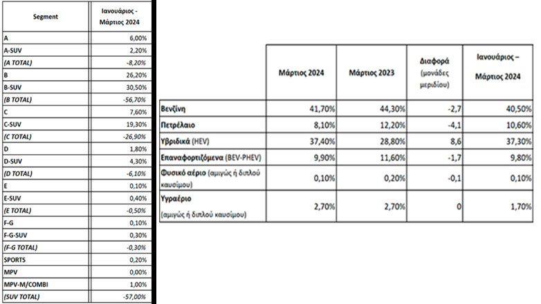 Οι προτιμήσεις των νέων ιδιοκτητών Ι.Χ από πλευράς κινητήρων (όσον αφορά το 3μηνο Ιανουάριος – Μάρτιος 224) ήταν: